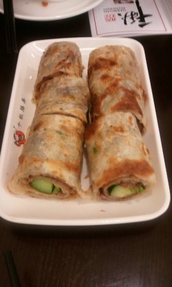 点了最爱的卤豆腐。豆腐外面是油炸过的,抱着浓郁的卤汁,由于豆腐不容易入味,必须沾着酱汁来吃。还点了大饼卷牛肉。大饼是在锅里面煎过的,外皮很香脆,里面有甜面酱味道的酱料、牛肉片、黄瓜、大葱啥的,搭配非常好吃,不油腻。查看更多