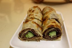 抽到开饭喇的50人下午茶试吃就在徐汇百脑汇B1层台北东区里面大饼卷牛肉很饱腹的饼皮筋道 里面卷着牛肉片 黄瓜条和甜面酱口感的酱料然后切成小段整齐摆在盘子里香香甜甜的 口感蛮好一直都觉得这道菜很像北方的春饼的做法额,,…查看更多