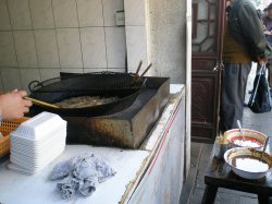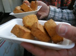 老街的特色啊。。。进入老街没走几步就能看到了哦~~而且两家臭豆腐店是并排着的,左右各一家~一家是国营的臭豆腐店~~这次吃的老街臭豆腐,打着某节目采访过的招牌~5块钱6块~~我觉得还不算贵~昌里路那家还一块钱一块呢~现炸出炉,臭的口水流啊。。哈哈~要了辣酱~~好吃,爽口~咸淡正合适~果然好吃~黑色的臭豆腐没敢尝试就是环境不怎么好,很多人堵在路口,吃好随手一丢~唉。。老街美食一条街也成垃圾一条街了~唉。。要习惯~话说师傅在油炸的时候记得要躲开远远的,免得被油溅到哦~查看更多