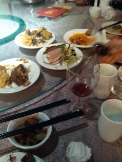 昨天去参加喜悦酒品酒会了,位置朝阳区青年路雅成一里服务楼小区底商,晚餐是自助形式,具体价位我就不知道了,是商家请我们吃的,嘿嘿,我们自助区有牛蛙、酱牛肉、烤羊腿、各种点心、最后还上了烤鸭,味道真的很不错尤其是酱牛肉酱汁很鲜,味道很爽口,我们吃的很狼藉啊