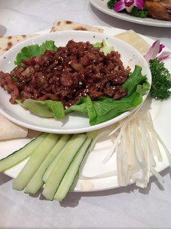这家店是什么菜系,其实我不知道,不过因为离家确实很近,看了下菜价,不贵。正好之前在附近有事,到了饭点就想找家店吃饭。周围有写生意好的已经没位子了,他们家人倒不是很多,关键是门口还能停车,很方便。店里的空间不是很大,我们坐的是四人桌,离旁边的桌子很近,完全没隐私。点了五六道菜吧,印象中有羊肉烩面、手撕包菜、刀豆土豆什么的,反正觉得量还是可以的。羊肉烩面不错,粗粗的面条更加有嚼劲,有点类似外面吃的刀削面,羊肉不多,但是羊肉的味道还是有的,证明是比较正宗的。貌似他们家还有其他分店,还行…查看更多