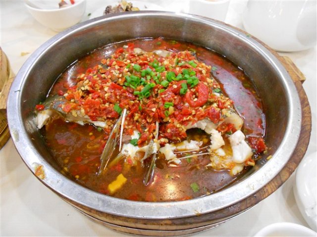 剁椒鱼头、大盆花菜、酸萝卜老鸭汤