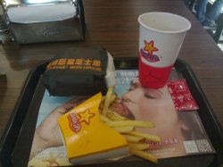 这是我见过最难找的卡乐星门店,可能是因为我是从8号线龙之梦出口进到商场的缘故吧。这家店开在商场连接3号线廊桥的出口,如果从3号线走过的话,倒是很好早。这从我点的是超级巨星芝士汉堡:汉堡还是那么的大,实在,比汉堡王最大的汉堡还要大。够霸气!!!这里饮料畅饮,很不错,有很多选择,诸如:各种碳酸类饮料、果汁、咖啡和茶水等。我果断续了2杯可乐。这里的餐巾纸是随便用的,不过纸巾的面积已经没有刚开业的时候大了。这次吃的汉堡,居然有点生,吃到后面我开始反胃了!不知道是偶尔的还是这家店就是如此。希望只是我一个人碰到。:(查看更多