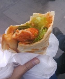 在莱迪底下的一家小清新卷饼店,两个MM做起饼来很仔细也很认真,所以速度略慢,但是也很值,因为分量很足哦,里面放的是鸡肉,饼底上面撒了一些芝士,放在烤箱里面烤一下,然后再在饼上面放上鸡肉,蔬菜,沙拉酱等,就OK了,由于撒了芝士的缘故,吃起来还有一些拉丝哦,鸡肉也蛮嫩的,是事先腌过以后炸熟的,比肯德基还好吃呢~