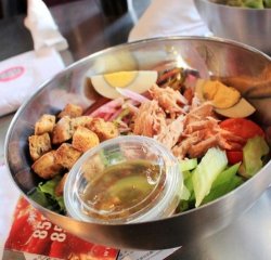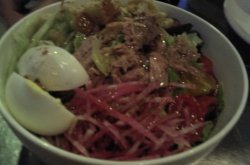 叫板!批萨~~其实,对于叫板批萨不陌生,在三里屯逛街的时候经常看到有酷酷的男生骑着电动车送批萨~~叫板!批萨!很醒目~~地方很好找。三里屯 V 的斜对面。跟将太一个楼~~看,门口好多送外卖的单车哦。呼呼~~所有来这的童鞋们都会跟叶子犯一个错误。那就是直接要上楼~~嘿嘿。对不起,人家楼上是 奥菲斯~~办公的~~嘿嘿,堂食的话就在楼下,三张不锈钢的小方桌上解决,当然还有贴着玻璃的一溜儿吧台桌这才是真整意义上的开放式厨房吧。收银台就在操作台前面。穿白色衣服的是操作员。粉色是服务员加收银员,黑色厚衣服滴就是随时有可能冲出去滴外卖生~~~靠窗的小吧台。不适合我。太高。太窄~~~批萨分很多种。特别推荐的会在菜单后面注明,面皮有两种。一种全麦,一种白面。有薄厚两种。一般情况下主推是全麦的面皮,号称全市独此一家,健康and营养~~对了。批萨分两种尺寸,中号和大号。我们要了两张中号的。此名:肉类爱好者~~65.00,有熏肉。培根。意大利红肠。等等吧。味道不错。就是全麦的饼皮吃上去有点儿发酵后的酸味儿。淡淡的哈。不影响口感我不爱吃生洋葱所以点了这个凯撒沙拉。又加了金枪鱼。特别说明的是,这里的金枪鱼是大块头的,方方的一块上面布满了黑胡椒粒。很咸,真的很咸。有半个鸡蛋,直立生菜,面包干,培根肉 rmb:60.00这个。豪华意大利拉条子~~头一回吃这样的意大利面,端上来的时候我很惊讶,当时我特别想跟服务员说:“服务员!来瓣儿蒜!”同行的姐妹淘让我端着碗最好上门口蹲着吃去。说这样才配的上这碗面~~这碗豪华意大利拉条子:50.00,第二张批萨是熏肉蘑菇的。颜色就偏淡一些,口感也不错~~就是上面放了香葱。让我一时有点儿不解。还好我对葱没那么抵触~~我上午打电话预定座位,接电话的女生说,这里不用定位,大家基本都叫外卖,店里没有人来。但是我们过去的时候已经没有啥座位了。。3.8节很抢手哦。幸亏我去的早。不然没地方做了都~~还有个小插曲,这里可能一共不锈钢的餐具(就是刀叉)就4套。四个人以外就要用塑料餐具了。嗯,~~陆陆续续的还有人过来吃饭,椅子也不够了。小矮桌子要用高高的吧台椅很别扭哦。呵呵,有三个高高的外国盆友就这样坐的。难受死了估计,基于不能妨碍人家做生意,俺们三个匆匆吃完就闪人啦~~~好人吧~…查看更多