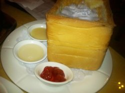 一份西多士,配了三种口味的沾酱,分别是:炼乳、色拉酱、番茄沙司。一个很实在的面包,表皮平滑,没有脱落、脱皮现象,所以上桌时卖相还是挺好的。顶个冰淇淋球,很快就化开,往下渗。面包软芯已被切成小方粒,轻轻一挑就起来。吃面包芯不用沾酱,冰淇淋的味道已经渗的很透,面包芯已经很软、很香甜了。掰下面包皮,已被烤的脆脆的了,比较香。个人比较喜欢其中的色拉酱口味。因为个头大,所以被称为巨无霸吧,3、4个人吃都可以,不知不觉很容易饱的。查看更多