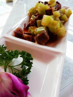 中午聚餐,迎接远道而来的战友们,于是选在了静谧之处,鸟语花香的元大都公园里面,如果路过,真会错过的,周边都是绿草茵茵的感觉,很难想到这里有家餐馆,虽然四周零星停车几辆车。类似一个大型四合院的感觉,门口的招牌都要靠支柱来撑着,进入里面,别有洞天,大院里面有三种不同的茶座,纳凉,聊天都不错。再往里面,是前台,散座和包间。木质地板,复古装修,浓浓的古朴味道。很给力的空调,吹散了热辣辣的骄阳。服务员似乎都是男生,倒也专业,就是不够热情哈,菜品的器皿都很一般,跟价位和环境不成比例的,至于味道嘛,有些是可圈可点的,这里明显适合商务宴请,私密细谈,或者悠闲的享受下午时光。温炝海笋(48元)很不起眼的一道菜,名字好听,味道奇特,海笋的空隙使得口感更佳具有韧性,微辣而小脆,据说很有营养。莴笋鸭胗(38元)我很喜欢的一道菜,卖相精致,味道极佳,笋块爽脆,鸭胗糥香,咸淡适中,温辣可口!我喜欢,我推荐,性价比很高。蒜香铁板牛肉(168元)卖相是几道精致菜里面,显而易见的。牛肉块头适口,一口一块,肉质有些嚼头,蒜香浓郁,量一般。辣烫虾仁(168元)相当好闻的一道菜啊,辣椒的鲜香马上就飘出来了!卖相一般,但是辣飘香,有水煮鱼的香味,里面是大大的虾仁,好吃,好看,就是量小哦!生噘鸡腰(168元)似乎是广东的出品,做法很传统,食材我第一次听,第一次看,不过我没吃,没勇气,哈哈。笋尖烧元宝肉(88元)好像红烧肉,里面还有鹌鹑蛋,口感很好,咸淡适中,肉质鲜嫩,层叠有序,真不错,性价比算高的。山椒蒸桂鱼(298元)价格珍贵,卖相真差,口感还好,肉质还好。对于小300元的菜品,配上这样的器皿,真够呛啊!松茸炒什菇(88元)味道真的很鲜美,量不大,贵在食材,健康的美味,无人能挡!石锅羊肉(128元)原来是羊肉,器皿是稍有讲究的,羊肉肥瘦先见,很香嫩的,量也不小,性价比还是不错的。椒麻鸡里脊(88元)实在是不想吃,因为卖相真的很差,对不起这个价格!红红的端上来,里面的食材一般,口感一般,弱弱的吃了一口而已。腊味炒饭(68元)难得很好吃哦,量真够大的,卖相和香味都不错,尤其腊肉的感觉,很好,想着这两天看的舌尖2,更加觉得好吃了。百年牛栏山36(280元)要不要这么贵哦,比超市贵好多。自制酸梅汤(180元)一扎没多大,可是好贵哦,味道很浓,我觉得自己也会做,哈。素烧茄子(58元)酸酸甜甜的,本身就喜欢茄子的我,非常喜欢这道菜,卖相一般,就是紫茄子的样子,浇汁的口感,锁住了更多的香味。肉沫烧豆腐(68元)清淡,家常的一道菜,就是营养而已。安吉白茶(50元)我没喝到啊,居然可以这么贵,一个人50元,不知道几杯,哈哈。清炒时蔬(58元)是油麦菜吧,很像家里做的,清清爽爽,我很喜欢哈。炸酱面(28元)绿色的菠菜汁做的,量不大,味道一般吧,没有爸爸做的好吃。服务费(539元)居然可以这么贵的,10%的服务费,问题我没有感到有特别热情的服务呢。商务宴请的地方,价格贵,味道家常,卖相不行,器皿更不行,至于服务嘛,没有让我感觉到,10%的支付是合理合适的,幸好大家一起为吃得开心,所以吃什么不重要了。…查看更多