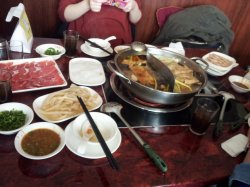 这里的麻辣火锅是同事一定要点的,因为听说这里的麻辣火锅还是相当有人气的,喝上去汤底就是很辣的感觉。我还是吃吃里面的鸭血和豆腐吧。鸭血吃上去口感很滑,很嫩的感觉。豆腐有种奶香味道,不过泡在麻辣锅里就感觉味道有些怪了查看更多