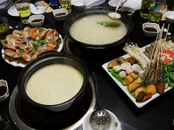 是套餐的,以前在来福士吃过,环境还可以比这里的好点。环境还是可以,不过从门口看黑兮兮的。点了228元的两人套餐,里面有很多dd,虾、蛤蜊、牛舌还有鱼竹轮,午餐肉、丸子等,加上蔬菜拼盘看着还蛮有胃口的,先把东西都涮进去吃掉然后加点米饭做成粥装,敲个鸡蛋进去,掏浆糊一样的,味道很清淡,自己弄点盐巴和油条,加点葱花就可以吃了,还可以吧。查看更多
