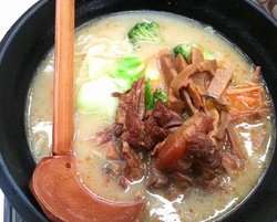 永旺国际商城购物中心1楼美食街上有一家味千拉面,他家的人不多,主要是价格不便宜。他家不用排队,到那就点餐,味千拉面是推荐的,很大一碗拉面,里面有肉片、木耳丝、蔬菜和单个蛋,个人感觉还算可以,主要他家的骨汤特别浓郁好喝,拉面又很劲道。查看更多