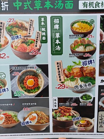 紅燒牛肉面 / 草本酸辣湯肥牛面 / 蟹黃面 / 草本番茄湯豚骨面 / 香辣湯豪橫肥腸面 / 鐵闆和牛肉串炒飯