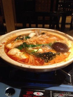 和彩日本料理这家店是比较纯正的日料餐厅,有刺身拼盘,寿司组合,三文鱼,鳕鱼片,比较有特色的是这边的泡菜火锅,大大的一锅子,一边吃一边有那种寿喜烧的炉子在加热的,泡菜片很大,烧了一段时间泡菜就很酥了,汤汁也是呈现橘红的颜色,不过不是特别的辣,里面有肉丸,肉片,还有金针菇,带有泡菜的鲜辣口味的金针菇很水嫩好吃。查看更多