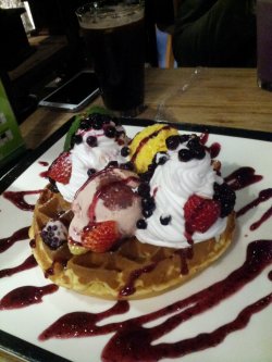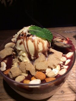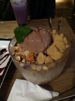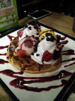 排队排了半个多小时啊,有团购,便宜很多,去的时候正好礼拜一,可以用团购,还有微信扫描活动,可以送拿铁咖啡,很给力哦。2个活动可以共享。点了一份紫薯拿铁,同学要喝,我喝了一口,感觉一般,没啥特别,不是很甜。咖啡冰山,很大的一碗,很大的冰淇淋在上面。下面都是沙冰,还有花生和麻薯,就是蛮贵的。冰淇淋华夫饼52元,很霸气的样子,上面2个冰淇淋求,2坨奶油,蛮好吃的,这个好甜的,还撒了很多蓝莓酱,好给力哦。反正蛮有情调的甜品店,有wifi,位子是自己找的,找好之后去排队点单。
