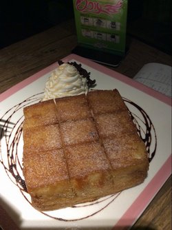 咖啡拿铁,上面的拉花没有拉好,爱心有点晕掉了,咖啡的味道淡淡的,不觉得苦涩,回味微甜微微苦,还不错。听说抹茶味和紫薯味的拿铁不错,下次要来试一试。巧克力华夫饼,很香,很酥脆,巧克力的味道比较浓郁,值得一试。