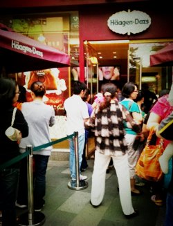 和老姐一起逛街又约在大宁商业区,自从有了这个好去处,几乎每次都和她约在这儿见面。逛逛商店淘淘衣服,完了在哈根达斯小坐一会儿继续逛,晚上还能找个吃饭的地方,虽然地方不大,可几乎满足了我们的所有需求~哈哈~这周末人是多得来,哈根达斯的门口排满了人,本来有点不高兴排队想闪人了~不过终究是经不住冰激凌的召唤,痴痴地在门口排了很久的队。看看,这个人超级多哦,话说这家哈根达斯的服务不太好,客人排队那么久还要看服务员脸色,其实说来蛮窝火的。希望这家店的经理要好好帮员工上上培训。要不然这家店的牌子真是要被砸掉了。我点了心花怒放,看着那么多球球就觉得很满足呀。颜色搭配超级好看,盘子也装饰的很嗲。赏心悦目的冰激凌,还没吃就心情好起来了。刚才排队神马的都抛之脑后啦。球球的口味依次是草莓味,咖啡味,芒果味,巧克力味,桑果雪芭,香草味。每一种口味都不错,不过相对而言酸酸甜甜的更得我心。长得实在讨人喜欢 ,没吃之前对着它狂拍~老姐点的东瀛禅趣,看上去花头蛮多的,不过每个都只有一点点。特别是水果的部分,真心少呀,这吃的果然是禅趣~3分味道7分感觉。这个名字不记得了,净顾着吃~喜欢华夫饼+巧克力+香蕉的组合,软软糯糯,香甜可口~ 不同的口感吃起来层次很多。是谁发明了这三者的组合,真是太聪明了。吃法吃法人开始少了,座位都开始空出来了,唉~要是一直人那么少就好了。这个位子蛮好的,墙角~安静 而且感觉蛮有味道的。希望下次有机会坐这里~查看更多