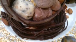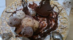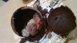 正好在公司附近想吃甜品,就找到了这家位于可以说是上海风景区新天地里面的哈根达斯啊,地方其实还是很好找的,地铁10号线的新天地和1号线的黄披北路出来都是可以到的,走走差不多路,就在太平洋淮海店边上,位于新天地里面,地理位置不错,环境也不错服务的态度很不错,到店直接上柠檬水,还热情的送上菜单,直接看着图片点单啊,看上了一个像个圆球一样的比利时绽放,不知道怎样,但是样子很不错啊等啊等啊,终于等到了和图片里面一摸一样的好大一个巧克力球啊,不同的是上面淋上了好多热的巧克力,估计是为了融开这个巧克力球吧,不错这个东西好像每个店的地方做法不一样,我朋友其他地方吃的时候,是热巧克力送上来自己淋的,大家品尝的时候可以自己注意下,如果喜欢自己浇的和店员说下,应该可以自己动手的。因为是他们浇好的,所以导致我用杈子敲了半天才吧大大的球敲开来啊,果然腹中有乾坤啊,好多个冰淇淋球直接进入眼帘啊这个巧克力球的里面果然是别有洞天啊,仔细的数数里面的冰淇淋球还真心的不少啊,一个有8个那么多呢,不过可能是因为长时间冻着的关系,好硬啊,等了一会儿才溶开了点,八个球基本上都是比利时巧克力口味,牛奶太妃口味,曲奇口味,香草口味,还有其他我也搞不清楚的味道啊,本人比较喜欢吃牛奶太妃啊味道不错,而且里面球多,点这个的话人多可以自己选择自己爱吃的味道吃啊,不错的除了里面的球还要说下,这个球里面还有很多很松脆的杏仁哦,一个个都很松脆很新鲜,味道不错,再者就是要说下外面的球的组成了,最下面是一层拉成丝做成的巧克力丝的底座,上面整个球全部是用巧克力做成的,真心的这个巧克力的量是大的不是一点点啊,大家可以看下我的照片,除非是真的超级无敌喜欢吃巧克力的朋友,不然的话还是不要点这个比较好,基本是巧克力要打包的,根本不可能吃完的,吃到最后觉得巧克力太多,腻啊,再好吃的东西吃多了总归会腻的大家看下下面的照片,是已经吃了很多巧克力之后的冰淇淋啊,量是真心大,如果喜欢吃巧克力的话可以组织多点人一起去吃,既可以吃的开心又不会因为吃太多的巧克力而腻到啊查看更多