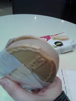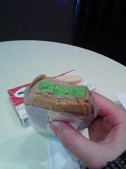 经过哈根达斯,进去吃个脆皮冰淇淋三明治,以前吃的都是香草口味的,这次一看有抹茶味的了,就尝试了一下。 冰淇淋外层咬一口嘎嘣脆啊,巧克力层不会很甜,冰淇淋颜色还真是有点鲜艳啊,抹茶味道挺浓郁的,奶味也比较足,吃一个蛮饱的说。 店面环境很不错,店员态度也不错。