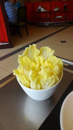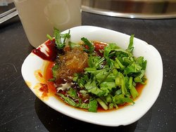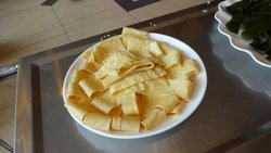 中午从大院出来就近来到这里吃火锅,火锅店开在酒店的裙楼里,比一般的火锅店显得环境要好一些。门口有自己的一块停车场,虽然不大,但还是能解决10多台车的停车问题。对食客免费开放。坐下后递上菜单,自己勾选想吃的菜品。点菜时服务员递上解渴的酸梅汤酸梅汤应该是用酸梅膏冲的,兑的有些偏浓。油碟是自助的,各类调料还算齐全。但花生末、芝麻、香油没有多少香味,影响了味道。还有装油碟的小碗,有很多破损的。做餐饮的应该不会不知道使用破餐具的忌讳吧?上锅底前服务员送来了围裙和装手机的自封袋,服务不错,美中不足的是送来的围裙不是太干净,上面有不少油脂污迹。凉拌毛豆马马虎虎,毛豆还算饱满,可惜味道不行不入味,盐都没有完全化开。点的鸳鸯锅锅底,这个鸳鸯锅底很失败,是我近几年吃点的最差的一次。无盐、无辣、无麻、无油,完全不知道是怎么配出来这样的锅底来的。一边等菜上桌,炉子也烧着锅底等着烧开,端来一盘盐水花生和西瓜来吃。西瓜可能是在调料台上放久了,隐约有点点发酸,西瓜挑选的也不够好,水分虽足但没多少甜味。盐水花生花生有不少烂的,吃到嘴里满嘴苦涩的味道。花生的味道也不均匀,有些有浓重的卤料味道有些就是白味。猪脑应该是冰冻的,不太新鲜。配上失败的锅底,点这个纯属补补自己的猪脑。腐竹失败的锅底糟蹋了食材,没有什么味道。只是吸饱了水变熟而已。鸭肠作为火锅必备的菜品,这家店的鸭肠相当失败,下锅一烫立马就变的极其袖珍,而不是卷曲收缩。吃在嘴里完全不用嚼,谈不上爽脆的口感。土豆片还是毁在了锅底,不过炉子火不大使得土豆片没有粘锅糊底还是蛮意外的。藕片这个得益于失败的锅底,保持了藕片的本味,口感脆脆的,还有些甜味。