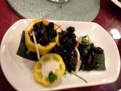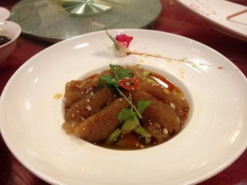 虽然地方比较大,而且场面比较宽阔。但是里面的菜的特色似乎缺少了一点,看到的是家常菜(常有的粤菜)。唐岛海鲜大酒店的红烧肉还是不错的,虽然筋肉没有肥肉多,但是肉质还是很饱满的,那个酱油卤烧的味道很浓,老板推荐的是她们的黑椒牛仔粒——说是她们的特色,不过个人感觉这道菜味道一般,有点太咸了。