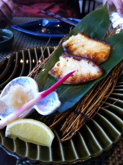 朋友欧洲回来提议一起吃饭,饭店我选。虽然不吃生鱼片,但是依然很哈日料这家5星商户正好没吃过,地段又好。店处于人民广场西藏中路,最最繁华的商区。只是一拐角,就冷清许多。思源,完全没人气的商厦,善知鸟日料客人不多显得很安逸。个人感觉这家店的客人群以日本客为主,因为满眼都是日文写的菜牌。原本想点478元的双人套餐来着,看看菜单这套餐竟然特色菜是一个也不包括。那还是单点吧,至少可以想吃自己喜欢的菜品,且有8折的优惠。浸蔬菜,想点点清爽的绿色菜,可惜的是将和风配错了地方,清新的蔬菜变得有点腥腥的了。善知鸟特色炸豆腐,豆腐油炸过再放入酱汁烧的,有各种菌菇相配,味道比较浓郁,豆腐口感嫰滑,多吃稍嫌甜腻了点。日式蛋卷,好大的7个,蛋做得很嫩,就是味道淡了点,甜味不够呀。烤银鳕鱼,没记错的话是88元,烤得焦黄的银鳕鱼放在绿色的叶上旁边还有红葱点缀,一份有2片,2个人吃刚刚好。银鳕鱼选料不错,吃上去嫩而多汁,烤的程度刚刚好,有点甜香,美味的。富士山熔岩烧拼盘,好像是198元,有牛排,牛肉,牛舌,金针菇,三文鱼等。选用的肉品质不错,吃上去满鲜的,只是我这种很怕茹毛饮血的人的牛排老了几分。熔岩烤全程由服务员亲自烤制,火候也会根据客人需要提供,不像我们这种非专业人士烤肉烤一身味道又不好。火焰冰激凌,呵呵,完全是吃气氛的一道甜品,我们这种已经不算是小姑娘的也容易中招呢,冰激凌放在一块饼干上用火烤了,外面吃上去有点点热,营造了冰火两重天的感觉。总体很不错的日料店,闹市中寻觅一份安静惬意。查看更多