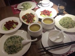 地址:解放碑民族路WFC环球金融中心5楼这家是川菜馆,很多创新的菜品,重口味的菜不太多,也许是考虑到外地人的口味吧.大红色为主调色很喜庆,场地比较大,生意好的缘故吧,点餐后大概等了十分钟,终于上菜了.菜菜饭是用油菜切碎和米饭一起炒的,但是油菜的口感个人不喜欢吃,小炒蒙古肉其实就是炒牛肉,比较辣,牛肉很嫩.萝卜排骨汤好喝,麻辣串串分量少,素多荤少.价格便宜.