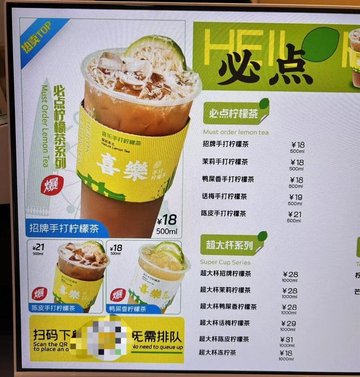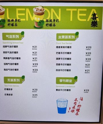 陳皮手打檸檬茶 / 話梅手打檸檬茶 / 勁涼手打檸檬茶 / 菠蘿手打檸檬茶 / 招牌氣泡手打檸檬茶 / 芒香手打檸檬茶