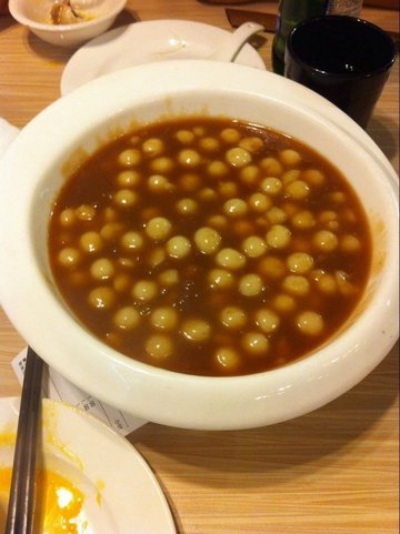 他家的元宝虾48元一份,涂了蜂蜜甜甜的,虾皮又脆又香都可以吃。特价菜酸缸豆炒鸡杂15元,鸡杂比较少,里面有泡椒很爽口。红豆沙圆子最赞,之前吃都是酒酿的,他家是红豆沙汤,甜品非常好喝。这次还免费送了一盘海带丝。