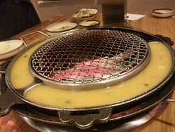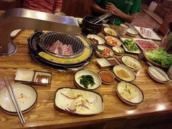 他家店面不算大,但比较好找,在楼上,进入店内,首先吸引我的是他家的餐座,很别致的,带着些许韩国风格,桌子略高出座位,很有新鲜感,果断选择这个区域落座,当然也有正统的中国餐桌,大家可以根据个人喜好选择用餐区。和大多数韩国烤肉类似,没人点一份肉,小菜无限量免费供应,他家还每人赠送一份主食,有石锅拌饭,冷面,大酱汤等,我们选择的是石锅拌饭和冷面。我点的肉是他家的特色坛香肉,很独特的香味,烤的嫩嫩的肉沾上酱很是可口,另一份我们点的是梅花肉,很大块,开始我们还担心能烤熟吗,结果出乎意料的好吃,肉很嫩,大块吃肉的感觉真爽!他家的小菜除了各种泡菜,还有土豆泥,很不错的,还有特色的就是鸡蛋羹,浇到烤炉的外圈,边烤肉边做鸡蛋羹。他家还有一大特点是24小时营业。查看更多