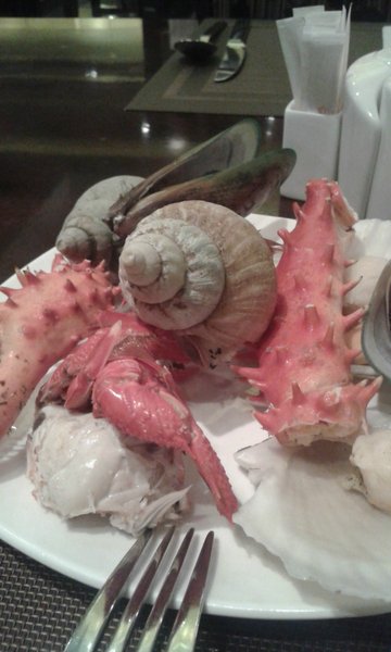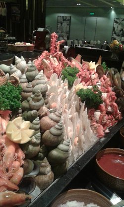 这家店的地理位置是建国门南大街7号北京万豪酒店1楼(北京站东), 建外大街。五星级酒店的自助就是品质高,虽然种类不那么多,但也真吃不了那么多种。淡绿色的大海螺,里面的肉很紧致,咬起来很有韧性,用叉子要用力插出来。阿拉斯加雪蟹,外皮像纸一样的,手一撕就开了,里面软嫩嫩的蟹肉很大一条。