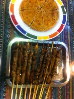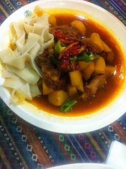 5点多到的,已经开始排起队了,拿了号等了大概半个小时左右进去了,新疆菜当然少不了羊肉串,4元一串,点了个羊肉包饼,42元,饼的张数倒是蛮多的,饼有点厚显的有点硬,馅料是羊肉,胡萝卜和洋葱,洋葱的比例比较多,羊肉很少,叫了碗单人份的羊杂汤,里面有一块羊肉,汤里放了点鲜辣粉去腥,味道还可以,叫了份主食面条,具体名称叫不出来了,面是手工擀出来的,很有嚼劲,但没什么配料,看到好多人都点大盘鸡拌面,下次想尝试一下,4个菜花了100大洋,味道都有点偏辣。