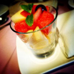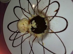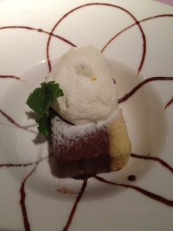 熔岩巧克力配香草冰激凌,两个都是球形的,一个深巧克力色,一个米黄色。巧克力熔岩蛋糕很好吃,比其他地方的都要好吃多了,蛋糕软硬适中,一勺子下去,巧克力酱就流了出来,味道不甜腻,很重的巧克力味道。配上旁边的香草冰激凌,算是冰火两重天了~查看更多