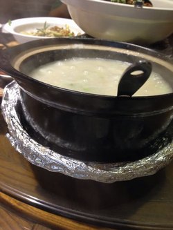 昨天中午跟一大群朋友在雪松的夏氏砂锅聚餐,隔壁就是米舍韩式石锅店,里面装修朴素喜欢用竹子状的木头装饰,店面不大人气很旺,中间大厅摆着四方小桌,靠里面墙设有两个半开的包间,地面油乎乎的走路需要小心。干锅花菜,虽然是瓷盘子装着的但是形状还是味道上都属于干锅味,花菜看起来没什么颜色吃起来倒是咸咸的还带着辣味,里面的猪头片半肥半瘦吃起来咸所以并不觉得肥腻,花菜也是难得烧得脆软适宜,入味得很,很好吃。汽水肉丸,里面一枚鸡蛋和数枚汽水肉丸,肉丸个头中等肉挺新鲜的,虽不会像牛肉丸那么紧凑,但还能保证肉嫩型不散,汤汁偏咸但喝起来也算鲜,鸡蛋煮在汤里面吸收了味道吃起来一点不寡淡,特别是蛋黄和汤一起吃又香又滑,还不错。臭干子一盘子大概有12块,是用白臭干子炸成金黄色捞出,豆腐外硬内软,配上中间的剁椒酱料吃起来又咸又辣,闻起来有淡淡的臭味吃进去只有焦香。小炒山药里面有五花肉片,炸出油脂后炒山药,山药脆甜咸香又带着点辣味,用猪油炒的辣椒很软又带着辣味,辣椒特别好吃,咸咸辣辣。盘子有点大,整个菜也只能装到一半,其实分量还可以的。比老村长好的是,菜烧得入味了但是老抽用的少,不会都是黑乎乎一团。烤生蚝,生蚝个头挺大的,蚝肉上面放了很多的蒜蓉,烤好后蒜香浓郁,刚端上特别烫手,能听到滋滋油响,蚝肉蛮新鲜的吃起来很弹,还蛮喜欢用重味调料烧烤生蚝,这样蚝肉肉质嫩又不带着腥味,筷子一拨一吸蚝肉就进嘴巴里,满口肉的感觉超级好。砂锅财鱼粥,端上来的时候不断冒着气泡,粥煮的很稠颜色也是乳白色,米粒熬得很烂都开了花,里面的鱼片剖得很薄,粥喝起来鲜,胡椒味特别重,可能是考虑到鱼肉的腥味,热乎乎的粥变得辣辣的, 整锅粥里面鱼片很少,混在粥里面变成很小一块。这个粥味道属于咸咸辣辣的。这家砂锅粥有好几种,比如海鲜粥是招牌,只能等下次再试试。这家店在雪松上都是老字号了,做也是老武汉的菜,味道稍咸,有些菜带着点辣味,在炎热的夏日重口的菜才能打开不振的食欲,味道整体都挺好的。…查看更多
