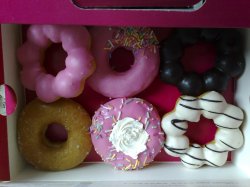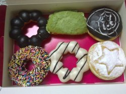 一大早 好吧 也就大概10点半左右才到的话说 一开始去的是一楼那边的小柜台只有一个小姑娘在那边 我说我是团购的她人很NICE的跟我说 团购不是在这边领的沿着阿达走到底好吧 个么我就走过去咯大概因为是周六的早上 所以店里面有点冷清也只有一个店员在先打了团购号然后开始选甜甜圈话说 真的是有点失望啊能选的只有6块钱的那种但是6块那里 有一半的甜甜圈都没有了唔 剩下的 很多都是草莓涂层的额 感觉看上去 就是一股香精味好吧 视线范围内瞄到角落还有一个黑巧克力的立马要么 然后 勉勉强强选了三个草莓的 一个原味的 还有一个白巧克力(也是剩最后一个)店员帮忙装在一个大盒子里面话说第一个吃的就是草莓的想看看到底有多失望不过吃下来真的还好额没有想象当中那一股很浓的香精味道口感还是不错的 不干下次去 估计要等一段时间再去 到时候多选几种其他口味查看更多