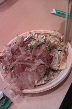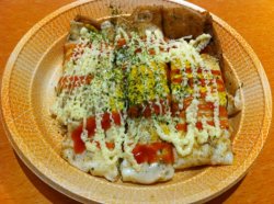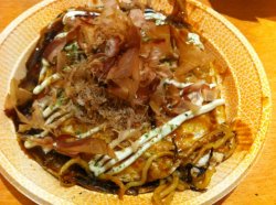 他们家是日本风,有大阪烧,章鱼小丸子什么的,尝试了一下大阪烧,等他烧好等了好久好久。。。大概半小时都有了,而且在我们等的过程中还有不少人来买,眼看着队伍越排越长,可是速度慢是慢的类,看着他多悠悠的铺面粉一层,洒些粉粉,再铺床上炒面,上面放了些料,在旁边敲了一个蛋,接着把2个拼在一起,接着又是无尽的等待。。。好不容易终于好了,撒上色拉酱,木鱼花,开动啦大阪烧的味道一般吧,还是比较喜欢日料店里吃的,还有广岛和关西风味可选,这边没选的,就一种,价格是29米一个好像章鱼小丸子是20米,大概8个左右吧,这个没吃,看着还行,下次去尝试一下查看更多