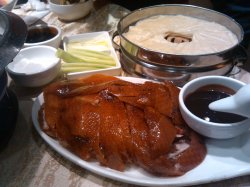 距离公司很近,部门小聚,宴请客户经常来这里。地址在朝阳区朝阳大屯路(近南沟泥河公交车站)。菜的味道都还中规中矩,不过菜量是越来越小,价钱是越来越贵。自己花钱一般很少来这里了。吃饭的环境还行的,就是包间的话不是全封闭式的,有点不方便;菜的话,基本上还行,菜量有点少,味道还行,菜品样式挺新颖的;本人觉得比较好吃的有蓝莓山药,葱油饼,鸭梨一锅鲜,都比较不错。金牌烤鸭肉大而厚,有点软。娃娃菜有点八成熟的样子。炸酱面太次,面和酱都很失败。焦溜丸子和甜辣土豆丝味道也一般。从菜上来说这里还算上中等的吧;这里可以考虑一下几个朋友在这里聚聚,不过要是想有隐蔽空间的话就别考虑这家了。…查看更多