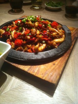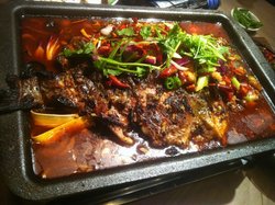 是我们设计界同行的聚会,来了8个人,选的这家店,其实第一个来拿号的很早就到了,确实他家的生意太火了,不过有个缺点没有大台子,而且桌子不能转,其实他家适合3 4个人的小聚会。他家的东西还是很辣的,从店名也能看出,他家的东西做的还是瞒精致的,口味也不错,点了烤鱼,翅汤野菌,粉蒸肉,蒜容开边虾,农家小炒肉、铁板鱿鱼须等。先说说铁板鱿鱼须,真心面象不错,味道也不错。鱿鱼须还算多,价格不贵,瞒好的!~~野菌汤也味道不错的,吃法还瞒复杂,先放在汤里唰,然后蘸料,味道很不错,可惜大家都爱辣,这个没怎么吃,让费了,东西还瞒多的,哈,其实要说,还是我胃口好,主要是我在吃!~~烤鱼,真心不错,点的是籽然味的,味道很不错的,量也不少。农家小炒肉,量少了点,东西味道还可以。金牌碳烤肉,不辣,味道好,吃辣的多了吃吃烤肉味道还真不错!~~~他家在环球港内,环球港的装修还真考究,地方很好找的,他家生意也异常火暴,排队的人很多,我们吃完九点多了,还是很多人,好象他家到九点就不能点单了,呵呵!~~
