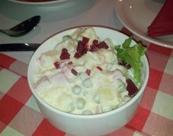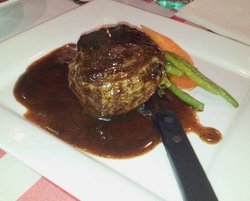 在三个妞都快要揭不开锅的时候我们还在这家吃了顿人均一百以上的晚饭真心是奢侈和心痛啊!这都怪我们聚会前没有在经济问题上有过沟通所造成的~环境:进门就觉得这么小的一家餐馆装修上的确是有些隆重了,一看就是老克勒们经常会光顾的店。以红色为主色调,灯光有些昏暗,加上客人的确是不多(原来根本不需要定位,整晚都没有超过过五桌客人)来这吃饭不管怎样都能图个清静!服务:小V见到我问的第一句话就是:这种类型的法国餐厅为什么服务员会是老阿姨们?我个问题我还真的不知道怎么回答,这也算是一大特色吧?而且其中有个阿姨好凶哦~整晚都没个笑脸,那个表情好像我们欠了她钱一样,不过其他的几个都还好,端菜的男生也很礼貌!点单:《特惠套餐》168元晚上有148和168两个套餐,看了一下发现148里没啥可选的,虽然最近都穷但在吃上也不能苦了自己,直接168套餐,不知道中午有没有~传统金必多汤听怪的名字,是寓意让人发财吗?内容倒是挺丰富,鱼翅,火腿,红肠,鸡丝~捉摸着老阿姨的意思是让我们点这个核算,应该是鱼翅切嘎地伐!味道很好,这是小菲的汤,得到她的好评应该是挺不错的,一开始我以为就是奶油蘑菇汤呢~~黑椒汁菲力牛排小V和小菲两个都是吃不来生牛肉的人,晕啊~无奈只能叫了七分熟的,如果当晚没有我在场她们单独吃饭的话那她们两个肯定是会叫十分熟的!不过上来的牛排被切开后我就能肯定那个没有七分,最多五分熟!只能让那个男服务生再端下去烤烤,不然肯定得我一个人吃~再次被端上来的牛排从一个圆得像狮子头的形状变成了条状,这种像狮子头一样的牛排考拉还是第一次见,挺有意思的~怪不得七分看似五分呢...原型的中间难熟啊!肉的确是熟了非常多,牛肉肉质很嫩,黑椒很重,就是牛肉的弹性欠缺了点!奶奶的牛油蛋糕这个蛋糕个人不是太喜欢,我喜欢稍稍松软一些的蛋糕,上面的奶油也一般~旁边配着的巧克力冰淇凌倒是不错,特别是对于喜欢百利甜酒的童鞋,这个冰淇凌的百利甜酒味非常重!《土豆色拉》38元太好吃了,土豆本身带着些许甜味,大块很酥!青豆玉米也煮得到位,还有红肠也是小时候的味道,连色拉酱都像我们以前自己用冰砖做出来的那种,儿时的味道好怀念!好好吃!《炸猪排》58元超级无敌大的一块,肉很不错,炸得火候刚好,很松脆!配的是辣酱油但小菲不爱,特地要了番茄酱,太惊喜啦~还是我们小时候吃到的味道,真不知道他们那里弄来这么原汁原味的东西,让我一下子就对他们家的印象好起来…只是量太大我们吃不完~《蔬菜汤》28元好喝的汤就算酸了点~《鸡丝局面》58元最最香的是上面那层烤过的芝士,里面的面条不值得一提,鸡丝不嫩但也说不上老,倒是里面奶油汁调得不错!他们家的价位真心不低,还算值得一试的。