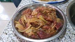 这家店在太原街大光明那个小吃胡同里,这里吃的挺多的,买了几样,然后决定找个地方解决,后来看见酸菜牛肉,好久没吃过了,于是进店决定试试。这家环境特别简陋,就是玻璃窗户,里面镶的瓷砖,看着不怎么干净,里面有一家外地人,还有个本地男人,6张左右小桌子,坐小马扎吃。我要了一份牛肉48一斤,只能要一斤。要了一份五花肉,一份酸菜10元,一份茧蛹22元,还有一份韭菜5元,要了一个干料一个麻酱料,一共消费107元,最后让老板抹了两元,挺不愿意的,中间想要杯白开水,告诉我没有,可以买花生露有热的,这点让人特别不舒服。牛肉,小铁盆的,一大盆,拌的洋葱,调味过的,肉比较嫩,烤过之后甜甜的,特别好吃,尤其跟酸菜一起,蘸上干料或者麻酱都不错。五花肉,挺薄一片,略肥一些,烤的金黄时候特别香,也挺好吃的。酸菜,这个好多店都差不多,跟家里酸菜不一样,特别细的丝,挺酸的,有股特殊的味道,我觉得配上肉特别好吃,还不错。茧蛹,拌的油和洋葱,一盘很少的几个,但是非常新鲜,都是活的,这个建议烤的时间要长一些,我烤的比较嫩,自己加的干料吃的,味道非常鲜,但是晚上回家发现过敏了,所以要小心。韭菜,这个是洗净切好段的,颜色非常好看,绿绿的,烤的软掉之后也是加些干料,特别好吃,如果在刷点辣椒酱就更好了。芝麻酱,这个不好,太稀了,一看就没少加水,一小碗,什么糖啊,葱花的什么也没调,不好吃。干料,芝麻,细辣酱粉,还有些花生粉的感觉,总之很香,这个好吃。建议两个人吃的话可以一干一稀,还不错。他家整体来说环境比较差,牛肉味道非常好,其他味道一般般,要说明的是啤酒30一瓶,有点贵,服务不怎么好,基本是没有服务。…查看更多