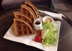 太平洋咖啡的秀水分店生意很好,里面的和露天的都是人多的很,价格倒是蛮实惠的。华夫饼我一直都很喜欢点,太平洋做的华夫饼还行,个头比较大把,不过不是酥脆的那种,而是软软的,很有柔性,吃起来挺甜的,浓浓的黄油香味。还搭配了一些沙拉,这个看起来略显鸡肋,分量太少,有一段火腿肠。咖啡的话也就是摩卡咖啡我比较喜欢喝,微微的熏甜味,没有太重的咖啡豆的苦涩感。查看更多