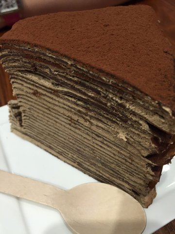 这家蛋糕店还是比较小众的那种,朋友推荐的,不然就算是路过也会错过的那种,千层巧克力蛋糕卖相不错,一层层看上去密密麻麻的,上层巧克力粉很浓郁但是也会存在微微的苦涩感,好在我的接收程度还是蛮高的,下面也是蛋糕层伴随着巧克力层,总体觉得甜度特别高,价格虽高,但是一块分量也着实给力啊,很大哦,建议一定要点清爽点的饮料,最好是矿泉水,不然真挺腻的。