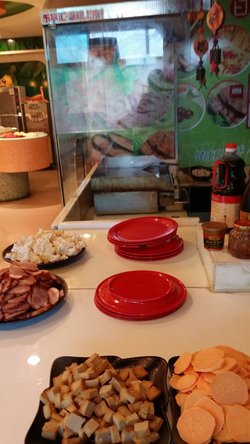 昨天中午终于把3个月前团购的好伦哥给吃了,当时糯米网秒杀的,10元1位,还是挺便宜的。这家店坐车302、95、595、379、984到静安庄下车在马路北边可以看到有个绿色的房子写的好伦哥,门牌号是西坝河东里83号。里面上楼梯到二层,先在前台交费或者验证然后给餐具,当时验证很快,服务员态度挺不错的,没有因为是团购而冷淡,给了餐具就进去了。里面不算大,食物种类不是特别多,不过有个铁板烧,说是日式的。我们俩拿了蛋挞、蛋糕、奶油蘑菇汤、海鲜汤、乌龙茶、水果、青菜、香芋球、薯条、匹萨、鸡翅根、咖喱、炒饭、洋葱圈、鸡蛋羹、鱼排、丸子、酸奶、爆米花和冰淇淋,另外还让炒了一盘铁板烧,其实我们俩吃的这些基本上就是里面都有的了,总体来说还是不错的。匹萨,没看到有新的,拿了2个口味的,都是带肉的,有一个还不错,有腊肠和肉丁,肉丁不错挺嫩的,腊肠稍微有点硬,饼底也稍微有点硬。蛋糕,拿了一个带桔子的貌似是巧克力的吧,还不错,蛋糕软软的。蛋挞,拿了上面不带水果的,有点温和的,烤得还不错,脆脆的,里面嫩嫩的,就是有点甜。香芋球,这个好吃,拿了2次,第一次热乎的,特别酥脆,里面香芋甜甜的,这个餐盘下面还有炸的粉丝也拿了一些吃也是脆脆的。洋葱圈,有点油,但是炸的很大,很完整的洋葱切的圈状。薯条,凉的,拿了2根,就是想尝尝。鱼排,炸的还不错,脆脆的,就是淀粉比较多。丸子,一个大肉丸子,老爸很喜欢,挺咸的。鸡翅根,我们俩一人就吃了一个,烤得味道还不错,就是有点干了,肉吃起来还倒可以。乌龙茶,有杯子和瓶子的,拿了一个杯子的,没有甜味的,喝起来很清爽的,挺解腻的。咖喱,去的时候都没有什么肉了,里面就一小块鸡肉了,土豆软绵绵的也不错,鸡肉还挺嫩的,咖喱味道挺浓郁的,后来拌着炒饭吃了。炒饭,蔬菜丁炒得,没有鸡蛋,炒的还挺香的,就是有点凉了。奶油蘑菇汤,还不错,里面碎蘑菇,就是温的,下面有点火的,但是点火都不热,奶油味道也还可以。海鲜汤,这个好喝,很热乎、很烫嘴,里面海鲜就是蟹肉棒,还有鸡蛋,鸡蛋打在里面的,软软嫩嫩的,蟹肉棒挺多的,喝起来胃里很舒服。酸奶,其实不是酸奶,而是乳酸菌,在里面加了一些爆米花,爆米花是热乎的,加在酸奶里面变得软软的、凉凉的也不错呢。冰淇淋,服务员帮着打的,打的一个旋儿,挺好看的,冰淇淋打的是双色,是香草和巧克力的,味道不错,没有冰渣,吃起来口感细绵绵的。…查看更多