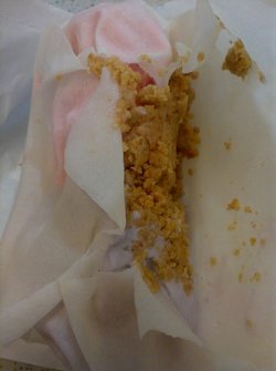 花生卷冰激凌,饼皮上分别放着香芋和草莓两个冰激凌球,然后再上面撒了很厚一层的花生碎。觉得饼皮的韧性有点强,所以咬起来会费一些力气。冰激凌其实挺冰的,放了有一段时间之后,吃起来的口感仍旧觉得很冰冻。觉得这种花生卷冰激凌,在味道上其实并没有什么特别,顶多是有点新奇而已。查看更多