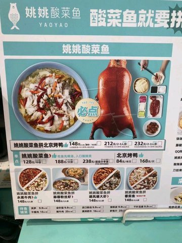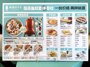 姚姚酸菜魚中份 / 彩虹烏龍冰粉 / 金獎米飯 / 姚姚酸菜魚拼水煮牛肉 / 姚姚脆奶 / 姚姚手撕椒麻雞