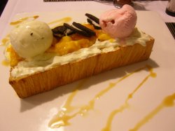 这家季诺的总店的环境还算优雅,很适合和朋友小坐聊天,免费的WIFI网络也可以让人们在闲暇的时候坐在店里,吃吃蛋糕,喝喝咖啡,再上上网。这次去他家吃的是最近新推出的一款点心,蜜糖吐司。这款点心的造型很可爱,长条形的吐司上面,先是涂着一层不薄也不厚的白奶油,再是一层橘红色的芒果酱,然后在吐司的上层的两端,各放着一个草莓冰激凌和一个香草冰激凌。用来放吐司的方形盘子上,撒着条条的焦糖。这道点心从头到尾带给我的口感就是一个字“甜”。冰激凌是冰冰的甜,芒果酱是香甜,奶油是淡淡的甜,吐司的底部蘸着焦糖,所以是甘甜的。虽然个人觉得蜜糖吐司有点甜,不过这吐司做的的确不错,里面很松软,而且有些手撕面包的那种一层层的状态,如果单吃的话,口感肯定很好。这蜜糖吐司如果搭配一杯冰咖啡,应该是个不错的组合。查看更多