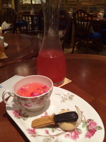 来安薇塔就来享受这种幽静、优雅的氛围,非常适合情侣或者闺蜜们来这里聊聊天谈谈心。装茶的杯子,盘子都好漂亮,花的图案。玫瑰露很好喝,酸酸甜甜的,很香,是纯天然的那种玫瑰花茶的味道,上面还飘着花瓣,很赏心悦目。再这里度过一个下午真的很美妙呢。
