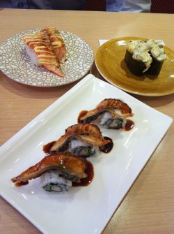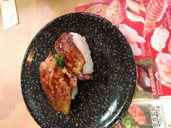 晚饭时间还没到 但是嘴馋了 之前吃过几次鹅肝寿司 so现在对鹅肝寿司很敏感呀也不管H7N9了 小吃一个应该没问题吧如果就性价比来看 是很超值的10块钱也能吃到鹅肝寿司哦 虽然只有小小的一个 但是寿司上的鹅肝也很嫩哦香香软软入口即化有木有。炎火三文鱼寿司也可以的 10米一份,两只星鳗寿司的星鳗很嫩 10米一份两个寿司米倒是很普通了 不过这个价格的话也不能要求太多了啊抹茶水是直接自己冲的 粉末细腻 我爱抹茶哈还有七香粉 和吉野家的那种差不多的感觉查看更多