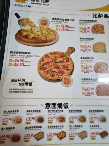 蘇丹王黃金果肉榴蓮比薩 / 新奧爾良烤翅 / 意大利肉醬面 / 新奧爾良烤雞肉拼香辣至尊比薩 / 尊寶風情烤翅 / 串烤雞脆骨