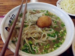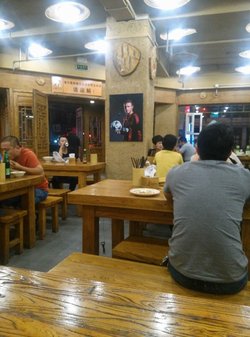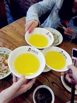 这家店吧,我觉得可以称之为传奇,之前这个位置开过几家店,但是都持续不了多久就关门大吉了,小李飞刀是时间最长,而且直到现在人依旧很多的,每天门口都停满了车,大堂里面都是人生鼎沸,吵吵闹闹的,人虽然多,但是每次去的时候总是能找到一、两个空座的,运气比较好,店员基本上都是5、6十岁的人,店内没有刮大白,都是土坯墙感觉,桌子都是实木的,看着很豪气,墙上的装饰物是一个树墩上面嵌着飞刀,为了切合店名??他家以汤面为主,一根根面条中间厚边上薄,汤的味道很好咸淡适中,吃面噎着了,来口汤,爽口又顺溜,哈哈~团购的骨汤面,四舍五入,5块钱吧,大大的一碗,很好,没有因为团购而少给什么的,非常实惠的说,骨汤面里没有什么其他的东西,上面撒了点小香葱和一点榨菜末,榨菜末非常有韧性啊,虽然没有味道,他家还提供免费的饮料,橙汁和酸梅汁,味道比较淡啦,水冲的,免费不限量,基本上每人一碗,因为没什么味道就是解渴来着,对了,饮品是用碗装的,有种江湖豪侠的赶脚呢…查看更多