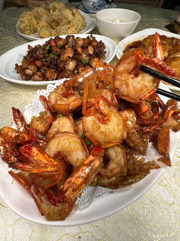 豉油皇大蝦 / 椒鹽九肚魚 / 凍檸茶 / 炒圣子皇 / 鹽焗奄仔蟹 / 豆豉雞