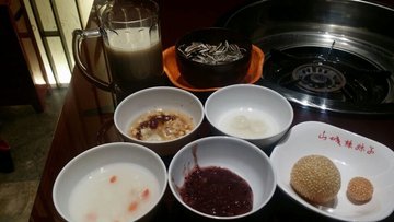 点了比较好看的功夫牛丸,不过吃着可真是太失望了,不如吃撒尿牛丸了,清汤锅底应该是鸡汤的吧,比较咸,点的小料都没用上,自助的烧饼特别好吃,小小的一个,又酥又脆,豆浆不好喝,银耳羹还不错,酒酿也还行。